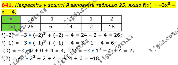 Накресліть у зошиті й заповніть таблицю 25, якщо f(x) = –Зx3 + x + 4. x –2 –1 0 1 2 f(x) 26 6 4 2 18 f(–2) = –3 • (–2)3 + (–2) + 4 = 24 – 2 + 4 = 26; f(–1) = –3 • (–1)3 + (–1) + 4 = 3 – 1 + 4 = 6; f(0) = –3 • 0 + 0 + 4 = 4; f(1) = –3 • 13 + 1 + 4 = 2; f(2) = –3 • 23 + 2 + 4 = –24 + 6 = –18.