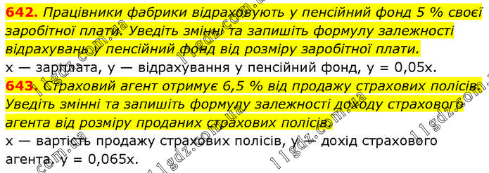 642. Працівники фабрики відраховують у пенсійний фонд 5 % своєї заробітної плати. Уведіть змінні та запишіть формулу залежності відрахувань у пенсійний фонд від розміру заробітної плати. x — зарплата, у — відрахування у пенсійний фонд, у = 0,05x. 643. Страховий агент отримує 6,5 % від продажу страхових полісів. Уведіть змінні та запишіть формулу залежності доходу страхового агента від розміру проданих страхових полісів. х — вартість продажу страхових полісів, у — дохід страхового агента. у = 0,065x.