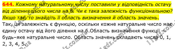 Кожному натуральному числу поставили у відповідність остачу від ділення цього числа на 6. Чи є така залежність функціональною? Якщо так, то знайдіть її область визначення й область значень. Так, ця залежність є функцію, оскільки кожне натуральне число має єдину остачу від його ділення на б.Область визначення функції — будь–яке натуральне число. Область значень складають числа 0, 1, 2, 3, 4, 5.