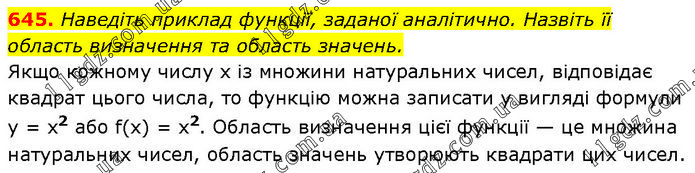 Наведіть приклад функції, заданої аналітично. Назвіть її область визначення та область значень. Якщо кожному числу x із множини натуральних чисел, відповідає квадрат цього числа, то функцію можна записати у вигляді формули у = x2 або f(x) = x2. Область визначення цієї функції — це множина натуральних чисел, область значень утворюють квадрати цих чисел.