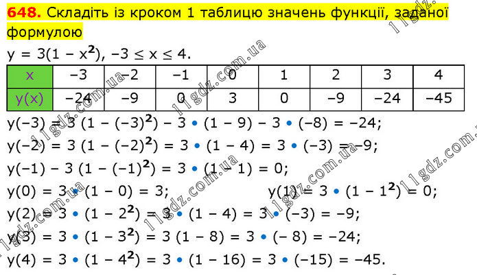 Складіть із кроком 1 таблицю значень функції, заданої формулою у = 3(1 – х2), –3 ≤ x ≤ 4. x –3 –2 –1 0 1 2 3 4 y(x) –24 –9 0 3 0 –9 –24 –45 y(–3) = 3 (1 – (–3)2) – 3 • (1 – 9) – 3 • (–8) = –24; y(–2) = 3 (1 – (–2)2) = 3 • (1 – 4) = 3 • (–3) = –9; y(–1) – 3 (1 – (–1)2) = 3 • (1 – 1) = 0; y(0) = 3 • (1 – 0) = 3; y(1) = 3 • (1 – 12) = 0; у(2) = 3 • (1 – 22) = 3 • (1 – 4) = 3 • (–3) = –9; y(3) = 3 • (1 – З2) = 3 (1 – 8) = 3 • (– 8) = –24; y(4) = 3 • (1 – 42) = 3 • (1 – 16) = 3 • (–15) = –45.