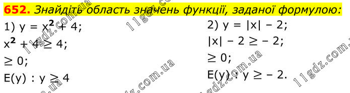 Знайдіть область значень функції, заданої формулою: 1) y = x2 + 4; x2 + 4 ≥ 4; ≥ 0; E(y) : y ≥ 4. 2) y = |x| – 2; |x| – 2 ≥ – 2; ≥ 0; E(y) : y ≥ – 2.