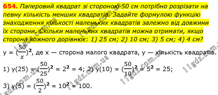 Паперовий квадрат зі стороною 50 см потрібно розрізати на певну кількість менших квадратів. Задайте формулою функцію знаходження кількості маленьких квадратів залежно від довжини їх сторони. Скільки маленьких квадратів можна отримати, якщо сторона кожного дорівнює: 1) 25 см; 2) 10 см; 3) 5 см; 4) 4 см? y = (50/x)2, де х — сторона малого квадрата, у — кількість квадратів. 1) y(25) = (50/25)2 = 22 = 4; 2) y(10) = (50/10)2 = 52 = 25; 3) y(5) = (50/2)2 = 102 = 100.