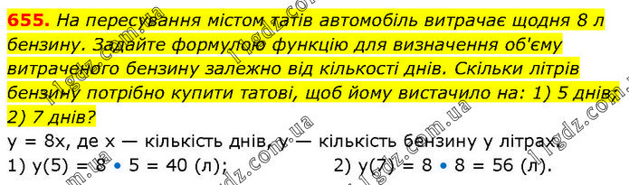 На пересування містом татів автомобіль витрачає щодня 8 л бензину. Задайте формулою функцію для визначення об'єму витраченого бензину залежно від кількості днів. Скільки літрів бензину потрібно купити татові, щоб йому вистачило на: 1) 5 днів; 2) 7 днів? у = 8x, де x — кількість днів, у — кількість бензину у літрах. 1) у(5) = 8 • 5 = 40 (л); 2) у(7) = 8 • 8 = 56 (л).
