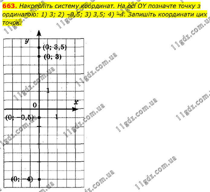 Накресліть систему координат. На осі OY позначте точку з ординатою: 1) 3; 2) –0,5; 3) 3,5; 4) –4. Запишіть координати цих точок.