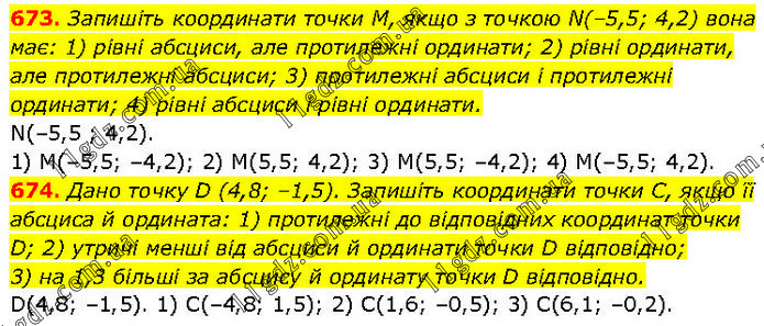 673. Запишіть координати точки M, якщо з точкою N(–5,5; 4,2) вона має: 1) рівні абсциси, але протилежні ординати; 2) рівні ординати, але протилежні абсциси; 3) протилежні абсциси і протилежні ординати; 4) рівні абсциси і рівні ординати. N(–5,5 ; 4,2). 1) М(–5,5; –4,2); 2) M(5,5; 4,2); 3) М(5,5; –4,2); 4) М(–5,5; 4,2). 674. Дано точку D (4,8; –1,5). Запишіть координати точки C, якщо її абсциса й ордината: 1) протилежні до відповідних координат точки D; 2) утричі менші від абсциси й ординати точки D відповідно; 3) на 1,3 більші за абсцису й ординату точки D відповідно. D(4,8; –1,5). 1) С(–4,8; 1,5); 2) С(1,6; –0,5); 3) С(6,1; –0,2).