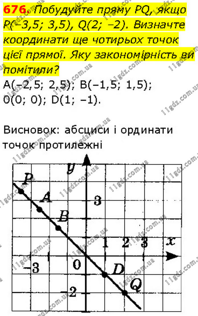 Побудуйте пряму PQ, якщо Р(–3,5; 3,5), Q(2; –2). Визначте координати ще чотирьох точок цієї прямої. Яку закономірність ви помітили? A(–2,5; 2,5); В(–1,5; 1,5); 0(0; 0); D(1; –1). Висновок: абсциси і ординати точок протилежні.