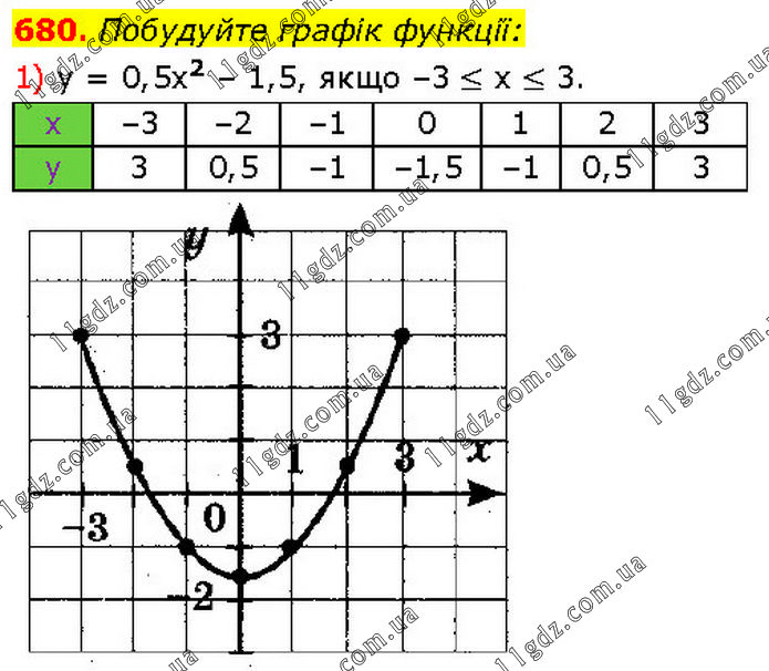 Побудуйте графік функції: 1) у = 0,5х2 – 1,5, якщо –3 ≤ х ≤ 3.