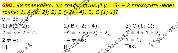Чи правильно, що графік функції у = Зх – 2 проходить через точку: 1) А (2; 2); 2) B (–2; –4); 3) С (1; 1)? y = 3x – 2; 1) A(2; 2); 2 = 3 • 2 – 2; 2 ≠ 4; Ні. 2) В (–2; –4); –4 = 3 • (–2) – 2; –4 ≠ –8; Ні. 3) С (1; 1); 1 = 3 • 1 – 2; 1 = 1; Так.
