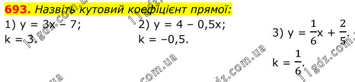 Назвіть кутовий коефіцієнт прямої: 1) у = 3х – 7; k = 3. 2) у = 4 – 0,5х; k = –0,5. 3) y = 1/6x + 2/5. k = 1/6.