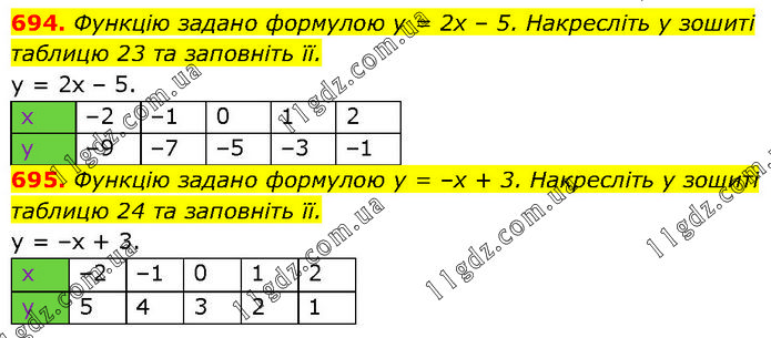 694. Функцію задано формулою у = 2х – 5. Накресліть у зошиті таблицю 23 та заповніть її. у = 2х – 5. 695. Функцію задано формулою у = –х + 3. Накресліть у зошиті таблицю 24 та заповніть її. y = –x + 3.
