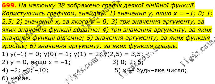 На малюнку 38 зображено графік деякої лінійної функції. Koристуючись графіком, знайдіть: 1) значення у, якщо х = –1; 0; 1; 2,5; 2) значення х, за якого у = 0; 3) три значення аргументу, за яких значення функції додатне; 4) три значення аргументу, за яких значення функції від'ємне; 5) значення аргументу, за яких функція зростає; 6) значення аргументу, за яких функція спадає. 1) y(–1) = 0; y(0) = 1; у(1) = 2; y(2,5) = 3,5; 2) у = 0, якщо х = –1; 3) 0; 2; 5; 4) –2; –3; –10; 5) х — будь–яке число; 6) немає.