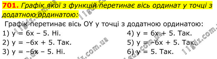 Графік якої з функцій перетинає вісь ординат у точці з додатною ординатою: Графік перетинає вісь OY у точці з додатною ординатою: 1) у = 6х – 5. Ні. 2) у = –6х + 5. Так. 3) у = –6х – 5. Ні. 4) у = 6х + 5. Так. 5) у = –6х + 5. Так. 6) у = 5. Так.