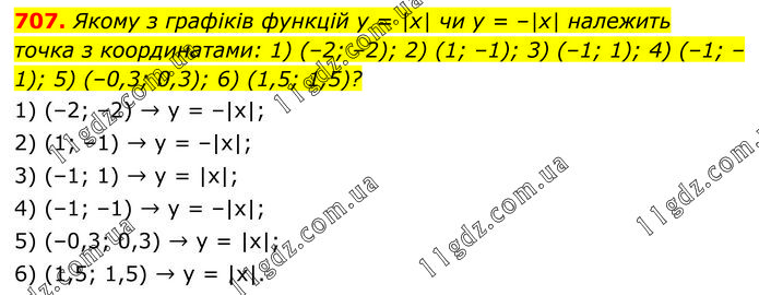 Якому з графіків функцій у = |х| чи у = –|х| належить точка з координатами: 1) (–2; –2); 2) (1; –1); 3) (–1; 1); 4) (–1; –1); 5) (–0,3; 0,3); 6) (1,5; 1,5)? 1) (–2; –2) → y = –|x|; 2) (1; –1) → y = –|x|; 3) (–1; 1) → y = |x|; 4) (–1; –1) → y = –|x|; 5) (–0,3; 0,3) → y = |x|; 6) (1,5; 1,5) → y = |x|.