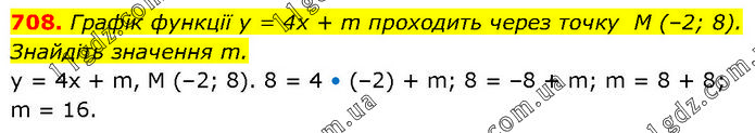 Графік функції у = 4х + m проходить через точку M (–2; 8). Знайдіть значення m. у = 4х + m, М (–2; 8). 8 = 4 • (–2) + m; 8 = –8 + m; m = 8 + 8; m = 16.