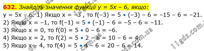 Знайдіть значення функції у = 5х – 6, якщо: у = 5x – 6. 1) Якщо x = –3 , то f(–3) = 5 • (–3) – 6 = –15 – 6 = –21. 2) Якщо х = –1, то f(–1) = 5 • (–1) – 6 = –5 – 6 = –11. 3) Якщо х = 0, то f(0) = 5 • 0 – 6 = –6. 4) Якщо x = 2, то f(2) = 5 • 2 – 6 = 10 – 6 = 4. 5) Якщо х – 4, то f(4) = 5 • 4 – 6 = 20 – 6 = 14.