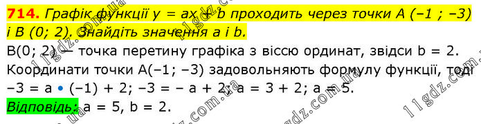Графік функції у = ах + b проходить через точки А (–1 ; –3) і В (0; 2). Знайдіть значення а і b. В(0; 2) — точка перетину графіка з віссю ординат, звідси b = 2. Координати точки А(–1; –3) задовольняють формулу функції, тоді –3 = а • (–1) + 2; –3 = – а + 2; а = 3 + 2; а = 5. Відповідь: а = 5, b = 2.