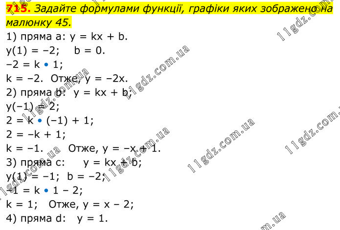 Задайте формулами функції, графіки яких зображено на малюнку 45. 1) пряма а: y = kx + b. y(1) = –2; b = 0. –2 = k • 1; k = –2. Отже, у = –2х. 2) пряма b: y = kx + b; y(–1) = 2; 2 = k • (–1) + 1; 2 = –k + 1; k = –1. Отже, у = –х + 1. 3) пряма с: y = kx + b; y(1) = –1; b = –2; –1 = k • 1 – 2; k = 1; Отже, у = х – 2; 4) пряма d: у = 1.