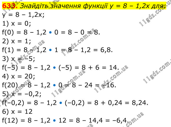Знайдіть значення функції у = 8 – 1,2х для: у = 8 – 1,2х; 1) х = 0; f(0) = 8 – 1,2 • 0 = 8 – 0 = 8. 2) x = 1; f(1) = 8 – 1,2 • 1 = 8 – 1,2 = 6,8. 3) x = –5; f(–5) = 8 – 1,2 • (–5) = 8 + 6 = 14. 4) x = 20; f(20) = 8 – 1,2 • 0 = 8 – 24 = –16. 5) x = –0,2; f(–0,2) = 8 – 1,2 • (–0,2) = 8 + 0,24 = 8,24. 6) x = 12 f(12) = 8 – 1,2 • 12 = 8 – 14,4 = –6,4.