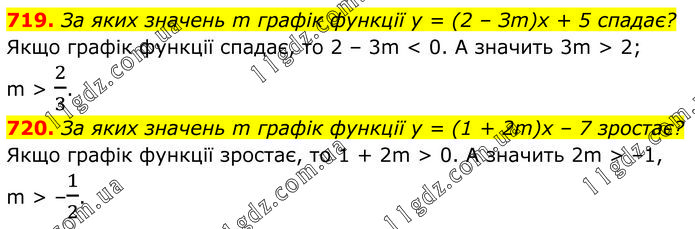 719. За яких значень m графік функції у = (2 – Зm)х + 5 спадає? Якщо графік функції спадає, то 2 – 3m < 0. А значить 3m > 2; m > 2/3. 720. За яких значень m графік функції у = (1 + 2m)х – 7 зростає? Якщо графік функції зростає, то 1 + 2m > 0. А значить 2m > –1, m > –1/2.