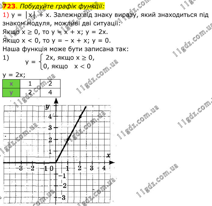 Побудуйте графік функції: 1) у = │x│ + х. Залежно від знаку виразу, який знаходиться під знаком модуля, можливі дві ситуації: Якщо х ≥ 0, то у = х + х; у = 2х. Якщо х < 0, то у = – х + х; у = 0. Наша функція може бути записана так: