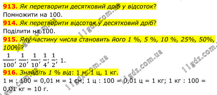 913. Як перетворити десятковий дріб у відсоток? Помножити на 100. 914. Як перетворити відсоток у десятковий дріб? Поділити на 100. 915. Яку частину числа становить його 1 %, 5 %, 10 %, 25%, 50%, 100%? 1/100; 1/20; 1/10; 1/4; 1/2; 1. 916. Знайдіть 1 % від: 1 м, 1 ц, 1 кг. 1 м : 100 = 0,01 м = 1 см; 1 ц : 100 = 0,01 ц = 1 кг; 1 кг : 100 = 0,01 кг = 10 г.