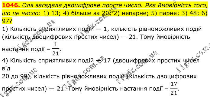 Оля загадала двоцифрове просте число. Яка ймовірність того, що це число: 1) 13; 4) більше за 20; 2) непарне; 5) парне; 3) 48; 6) 97? 1) Кількість сприятливих подій — 1, кількість рівноможливих подій (кількість двоцифрових простих чисел) — 21. Тому ймовірність настання події – 1/21. 4) Кількість сприятливих подій — 17 (двоцифрових простих чисел від 20 до 99), кількість рівноможливих подій (кількість двоцифрових простих чисел) — 21. Тому ймовірність настання події – 17/21.