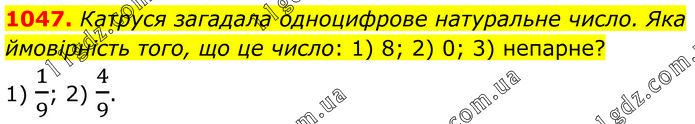 Катруся загадала одноцифрове натуральне число. Яка ймовірність того, що це число: 1) 8; 2) 0; 3) непарне? 1) 1/9; 2) 4/9.