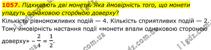 Підкидають дві монети. Яка ймовірність того, що монети упадуть однаковою стороною доверху? Кількість рівноможливих подій — 4. Кількість сприятливих подій — 2. Тому ймовірність настання події «монети впали однаковою стороною доверху» – 2/4 = 1/2.