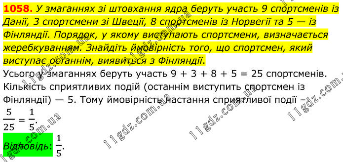 У змаганнях зі штовхання ядра беруть участь 9 спортсменів із Данії, 3 спортсмени зі Швеції, 8 спортсменів із Норвегії та 5 — із Фінляндії. Порядок, у якому виступають спортсмени, визначається жеребкуванням. Знайдіть ймовірність того, що спортсмен, який виступає останнім, виявиться з Фінляндії. Усього у змаганнях беруть участь 9 + 3 + 8 + 5 = 25 спортсменів. Кількість сприятливих подій (останнім виступить спортсмен із Фінляндії) — 5. Тому ймовірність настання сприятливої події – 5/25 = 1/5. Відповідь: 1/5.