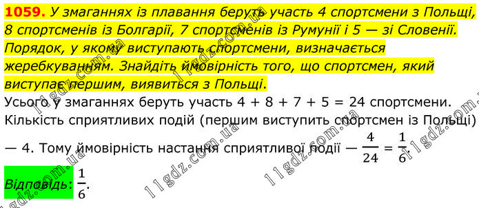 У змаганнях із плавання беруть участь 4 спортсмени з Польщі, 8 спортсменів із Болгарії, 7 спортсменів із Румунії і 5 — зі Словенії. Порядок, у якому виступають спортсмени, визначається жеребкуванням. Знайдіть ймовірність того, що спортсмен, який виступає першим, виявиться з Польщі. Усього у змаганнях беруть участь 4 + 8 + 7 + 5 = 24 спортсмени. Кількість сприятливих подій (першим виступить спортсмен із Польщі) — 4. Тому ймовірність настання сприятливої події — 4/24 = 1/6. Відповідь: 1/6.