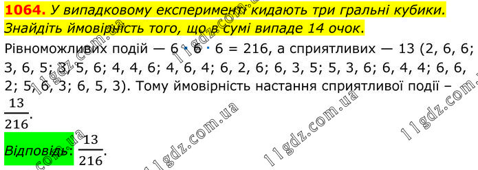 У випадковому експерименті кидають три гральні кубики. Знайдіть ймовірність того, що в сумі випаде 14 очок. Рівноможливих подій — 6 ∙ 6 ∙ 6 = 216, а сприятливих — 13 (2, 6, 6; З, 6, 5; 3, 5, 6; 4, 4, 6; 4, 6, 4; 6, 2, 6; 6, 3, 5; 5, 3, 6; 6, 4, 4; 6, 6, 2; 5, 6, 3; 6, 5, 3). Тому ймовірність настання сприятливої події – 13/216. Відповідь: 13/216.
