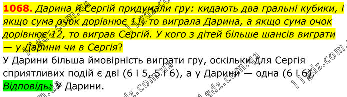 Дарина й Сергій придумали гру: кидають два гральні кубики, і якщо сума очок дорівнює 11, то виграла Дарина, а якщо сума очок дорівнює 12, то виграв Сергій. У кого з дітей більше шансів виграти — у Дарини чи в Сергія? У Дарини більша ймовірність виграти гру, оскільки для Сергія сприятливих подій є дві (6 і 5, 5 і 6), а у Дарини — одна (6 і 6). Відповідь: У Дарини.
