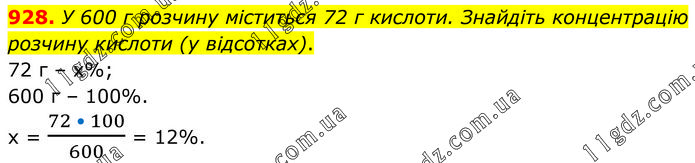 У 600 г розчину міститься 72 г кислоти. Знайдіть концентрацію розчину кислоти (у відсотках). 72 г – х%; 600 г – 100%. х = (72 • 100)/600 = 12%.