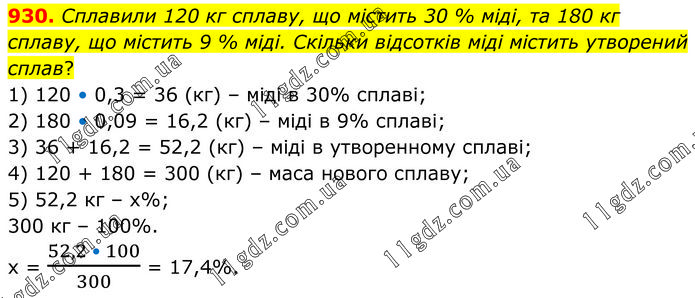 Сплавили 120 кг сплаву, що містить 30 % міді, та 180 кг сплаву, що містить 9 % міді. Скільки відсотків міді містить утворений сплав? 1) 120 • 0,3 = 36 (кг) – міді в 30% сплаві; 2) 180 • 0,09 = 16,2 (кг) – міді в 9% сплаві; 3) 36 + 16,2 = 52,2 (кг) – міді в утворенному сплаві; 4) 120 + 180 = 300 (кг) – маса нового сплаву; 5) 52,2 кг – х%; 300 кг – 100%. х = (52,2 • 100)/300 = 17,4%.
