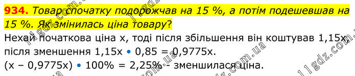Товар спочатку подорожчав на 15 %, а потім подешевшав на 15 %. Як змінилась ціна товару? Нехай початкова ціна х, тоді після збільшення він коштував 1,15х, після зменшення 1,15х • 0,85 = 0,9775х. (х – 0,9775х) • 100% = 2,25% - зменшилася ціна.