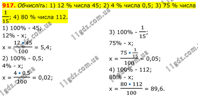 Обчисліть: 1) 12 % числа 45; 2) 4 % числа 0,5; 3) 75 % числа 1/15; 4) 80 % числа 112. 1) 100% - 45; 12% - х; х = (12 • 45)/100 = 5,4; 2) 100% - 0,5; 4% - х; х = (4 • 0,5)/100 = 0,02; 3) 100% - 1/15; 75% - х; х = (75 • 1/15)/100 = 0,05; 4) 100% - 112; 80% - х; х = (80 • 112)/100 = 89,6.