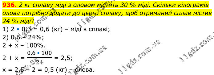 2 кг сплаву міді з оловом містить 30 % міді. Скільки кілограмів олова потрібно додати до цього сплаву, щоб отриманий сплав містив 24 % міді? 1) 2 • 0,3 = 0,6 (кг) – міді в сплаві; 2) 0,6 – 24%; 2 + х – 100%. 2 + х = (0,6 • 100)/24 = 2,5; х = 2,5 – 2 = 0,5 (кг) – олова.