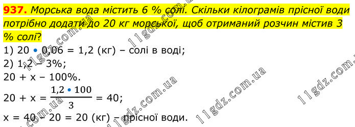 Морська вода містить 6 % солі. Скільки кілограмів прісної води потрібно додати до 20 кг морської, щоб отриманий розчин містив 3 % солі? 1) 20 • 0,06 = 1,2 (кг) – солі в воді; 2) 1,2 – 3%; 20 + х – 100%. 20 + х = (1,2 • 100)/3 = 40; х = 40 – 20 = 20 (кг) – прісної води.