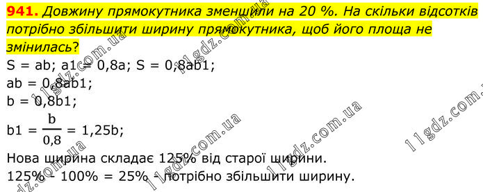 Довжину прямокутника зменшили на 20 %. На скільки відсотків потрібно збільшити ширину прямокутника, щоб його площа не змінилась? S = ab; a1 = 0,8a; S = 0,8ab1; ab = 0,8ab1; b = 0,8b1; b1 = b/0,8 = 1,25b; Нова ширина складає 125% від старої ширини. 125% - 100% = 25% - потрібно збільшити ширину.