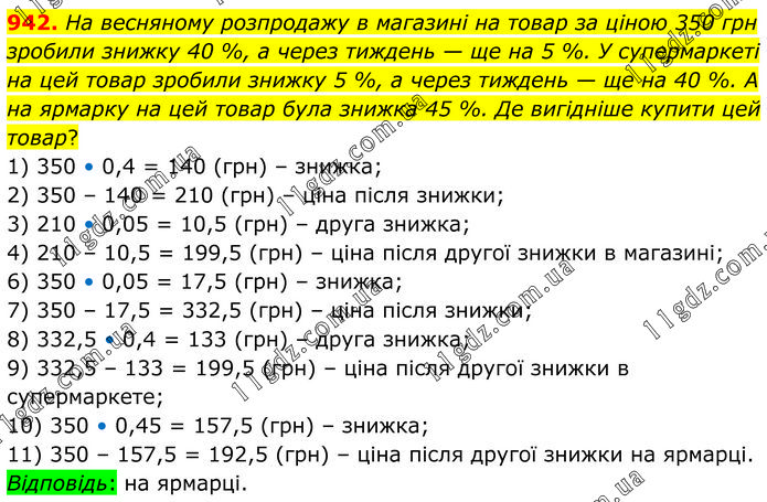 На весняному розпродажу в магазині на товар за ціною 350 грн зробили знижку 40 %, а через тиждень — ще на 5 %. У супермаркеті на цей товар зробили знижку 5 %, а через тиждень — ще на 40 %. А на ярмарку на цей товар була знижка 45 %. Де вигідніше купити цей товар? 1) 350 • 0,4 = 140 (грн) – знижка; 2) 350 – 140 = 210 (грн) – ціна після знижки; 3) 210 • 0,05 = 10,5 (грн) – друга знижка; 4) 210 – 10,5 = 199,5 (грн) – ціна після другої знижки в магазині; 6) 350 • 0,05 = 17,5 (грн) – знижка; 7) 350 – 17,5 = 332,5 (грн) – ціна після знижки; 8) 332,5 • 0,4 = 133 (грн) – друга знижка; 9) 332,5 – 133 = 199,5 (грн) – ціна після другої знижки в супермаркете; 10) 350 • 0,45 = 157,5 (грн) – знижка; 11) 350 – 157,5 = 192,5 (грн) – ціна після другої знижки на ярмарці. Відповідь: на ярмарці.