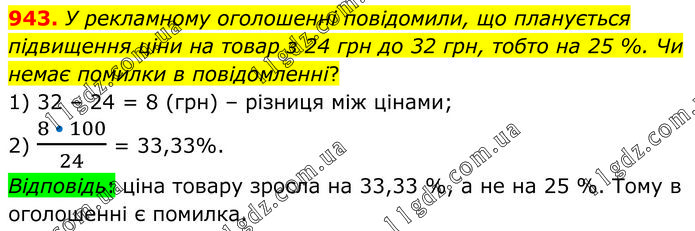 У рекламному оголошенні повідомили, що планується підвищення ціни на товар з 24 грн до 32 грн, тобто на 25 %. Чи немає помилки в повідомленні? 1) 32 – 24 = 8 (грн) – різниця між цінами; 2) (8 • 100)/24 = 33,33%. Відповідь: ціна товару зросла на 33,33 %, а не на 25 %. Тому в оголошенні є помилка.