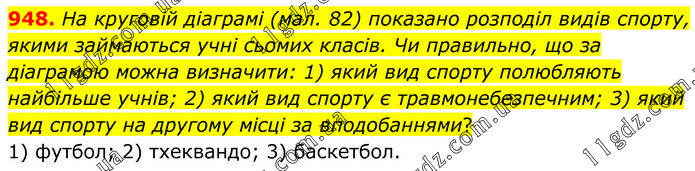 На круговій діаграмі (мал. 82) показано розподіл видів спорту, якими займаються учні сьомих класів. Чи правильно, що за діаграмою можна визначити: 1) який вид спорту полюбляють найбільше учнів; 2) який вид спорту є травмонебезпечним; 3) який вид спорту на другому місці за вподобаннями? 1) футбол; 2) тхеквандо; 3) баскетбол.