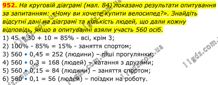 На круговій діаграмі (мал. 84) показано результати опитування за запитанням: «Чому ви хочете купити велосипед?». Знайдіть відсутні дані на діаграмі та кількість людей, що дали кожну відповідь, якщо в опитуванні взяли участь 560 осіб. 1) 45 + 30 + 10 = 85% - всі, крім 3; 2) 100% - 85% = 15% - заняття спортом; 3) 560 • 0,45 = 252 (людини) – піші прогулянки; 4) 560 • 0,3 = 168 (людей) – катання з друзями; 5) 560 • 0,15 = 84 (людини) – заняття спортом; 6) 560 • 0,1 = 56 (людей) – поїздки на роботу.