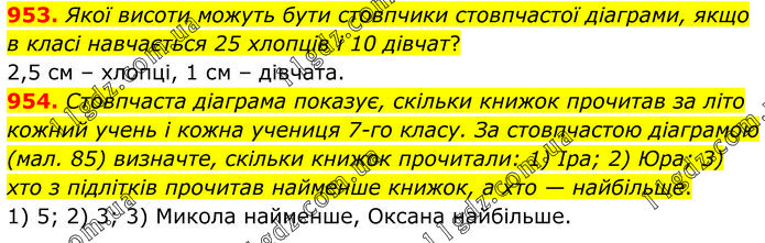 953. Якої висоти можуть бути стовпчики стовпчастої діаграми, якщо в класі навчається 25 хлопців і 10 дівчат? 2,5 см – хлопці, 1 см – дівчата. 954. Стовпчаста діаграма показує, скільки книжок прочитав за літо кожний учень і кожна учениця 7-го класу. За стовпчастою діаграмою (мал. 85) визначте, скільки книжок прочитали: 1) Іра; 2) Юра; 3) хто з підлітків прочитав найменше книжок, а хто — найбільше. 1) 5; 2) 3; 3) Микола найменше, Оксана найбільше.