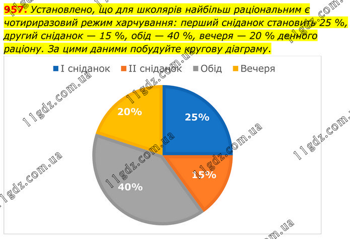 Установлено, що для школярів найбільш раціональним є чотириразовий режим харчування: перший сніданок становить 25 %, другий сніданок — 15 %, обід — 40 %, вечеря — 20 % денного раціону. За цими даними побудуйте кругову діаграму.