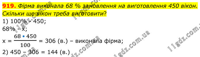 Фірма виконала 68 % замовлення на виготовлення 450 вікон. Скільки ще вікон треба виготовити? 1) 100% - 450; 68% - х; х = (68 • 450)/100 = 306 (в.) – виконала фірма; 2) 450 – 306 = 144 (в.)
