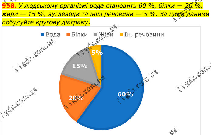 У людському організмі вода становить 60 %, білки — 20 %, жири — 15 %, вуглеводи та інші речовини — 5 %. За цими даними побудуйте кругову діаграму.
