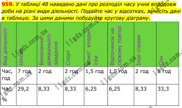 У таблиці 48 наведено дані про розподіл часу учня впродовж доби на різні види діяльності. Подайте час у відсотках, занесіть дані в таблицю. За цими даними побудуйте кругову діаграму.