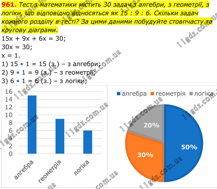 Тест з математики містить 30 задач з алгебри, з геометрії, з логіки, що відповідно відносяться як 15 : 9 : 6. Скільки задач кожного розділу в тесті? За цими даними побудуйте стовпчасту та кругову діаграми. 15х + 9х + 6х = 30; 30х = 30; х = 1. 1) 15 • 1 = 15 (з.) – з алгебри; 2) 9 • 1 = 9 (з.) – з геометрії; 3) 6 • 1 = 6 (з.) – з логіки;